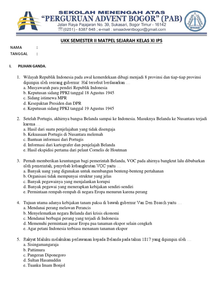 Jun 16, 2020 · soal pat sejarah peminatan kelas 11 sma tahun 2021. 75 latihan soal sejarah kelas xi semester ganjil beserta jawabannya 1. Soal pts sejarah minat kelas 11 semester 1 tahun 2021. Sudah tak terasa kita sudah masuk ke akhir semester genap. Selengkapnya, silahkan download soal dan kunci jawaban pat/ukk sejarah peminatan kelas 11 sma/ma kurikulum 2013 pada link dibawah ini;